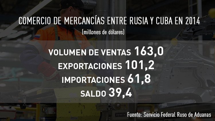 Según datos del Servicio Federal Ruso de Aduanas recogidos en un informe del Ministerio ruso de Desarrollo Económico, el volumen de ventas de mercancías entre Rusia y Cuba en 2014 alcanzó 163 millones de dólares, mientras que el volumen de exportaciones e importaciones fue de 101,2 y 61,8 millones de dólares respectivamente. El saldo comercial positivo en 2014 alcanzó 39,4 millones de dólares.