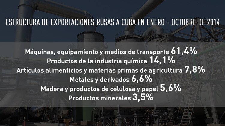 A su vez, el componente principal en la estructura de importaciones cubanas a Rusia son los artículos alimenticios y materias primas de agricultura.