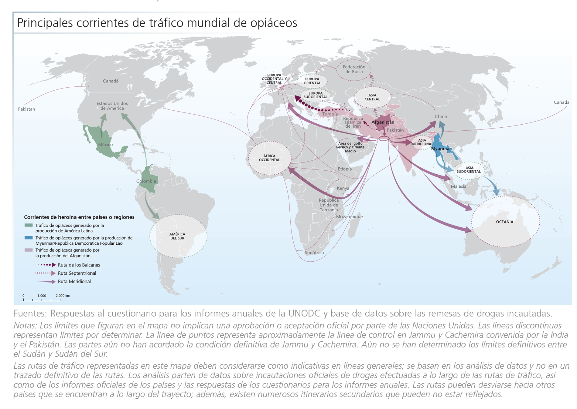 La UNODC indica que existe una alteración en el suministro de heroína en diferentes regiones. Por ejemplo, Afganistán es el suministrador del 90% de la heroína consumida en Canadá, un tipo de droga que también se consume en EE.UU. pero a donde llega procedente de Centroamérica y América del Sur. No obstante, la situación está cambiando: el análisis de la heroína incautada en el territorio estadounidense ha demostrado que el volumen de la heroína afgana tiene un potencial creciente y puede estar llegando a nuevos mercados.