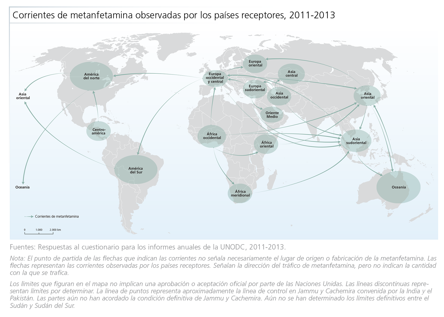 A pesar de ello, la metanfetamina sigue dominando el mercado mundial de drogas sintéticas. Un mercado cada vez más diversificado de metanfetamina se expande en Asia oriental y sudoriental. Por otra parte, en varias regiones de América del Norte y Europa está creciendo el consumo de metanfetamina cristalizada. "África occidental parece haberse consolidado como fuente de la metanfetamina que se introduce de contrabando en Asia oriental y sudoriental a través de África meridional o Europa, y hay nuevas rutas de tráfico que enlazan mercados regionales de metanfetamina que antes no estaban conectados", revela el informe.
