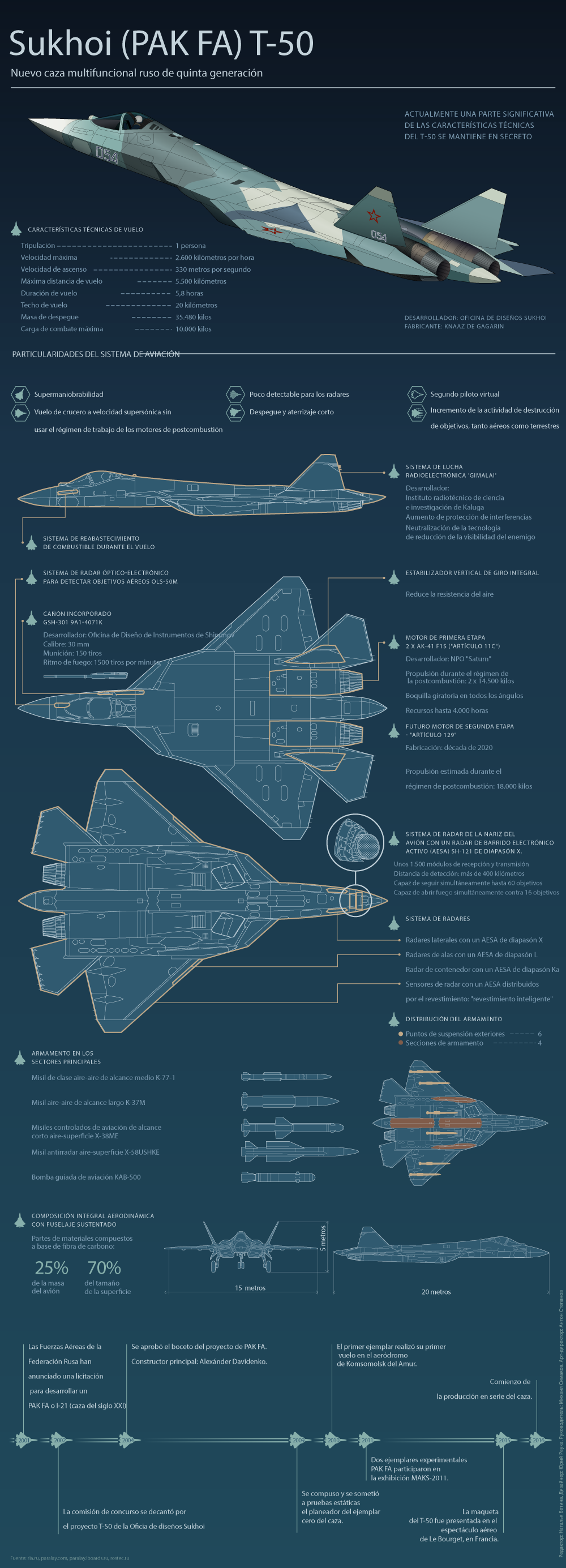 Desde 2017, Rusia fabricará en serie el caza multifuncional furtivo ruso de quinta generación T-50 (PAK-FA), según ha indicado el comandante en jefe y coronel general de la Fuerza Aérea rusa, Víktor Bóndarev. Cuando entre en servicio, este cazabombarderos será el más moderno y mejor equipado de la aviación táctica de ese país y, según sus expertos militares, superará a sus competidores, incluido el F-22 Raptor estadounidense, en casi todos los criterios y, en particular, en el armamento, indica la agencia TASS.