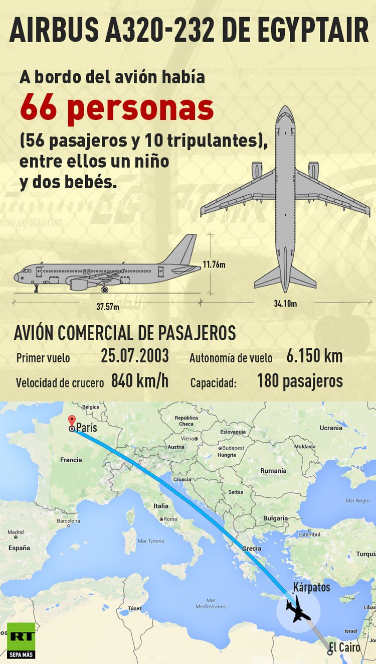 El avión desaparecido de la aerolínea EgyptAir, que cubría la ruta París-El Cairo con 66 personas a bordo, se estrelló el pasado jueves cerca de la isla griega de Kárpatos, a unos 280 kilómetros de la costa egipcia.