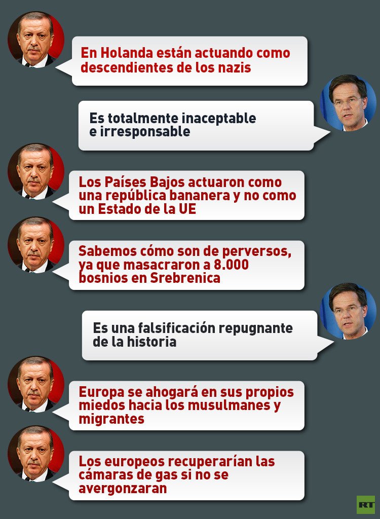 A ello se une el agudo enfrentamiento político entre Turquía y los Países Bajos que estalló en marzo y que comenzó con la prohibición por Amsterdam de la llegada al país de varios altos funcionarios de Ankara, que se disponían a dar discursos ante turcos con doble ciudadanía sobre el referéndum constitucional del próximo 16 de abril, lo que derivó en un cruce de acusaciones entre Erdogan y las autoridades de los Países Bajos, a las que el mandatario acusó de "nazis y fascistas".