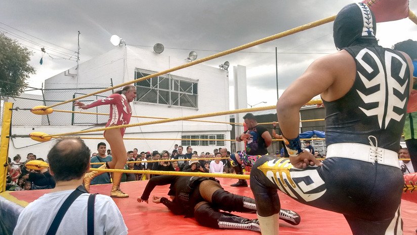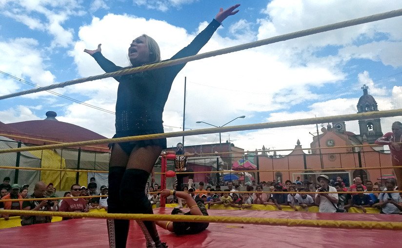 "Cárguenlo y a la verga", se escucha decir desaforadamente a un puñado de chiquillos desde la improvisada tribuna en torno al cuadrilátero instalado en una plazoleta que antecede al templo de San Francisco de Asís, donde luchan dos divas.