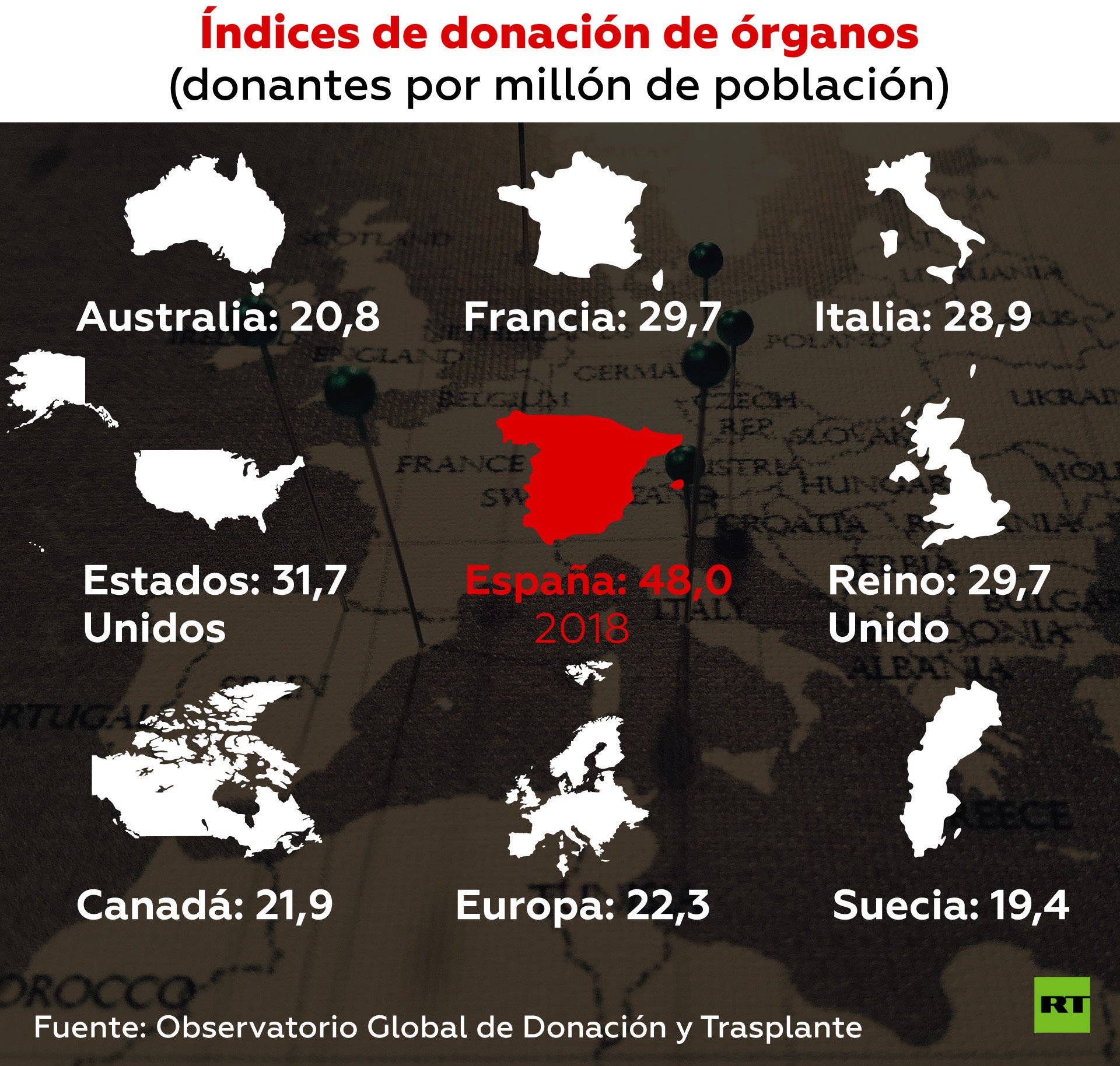 En 2018 España alcanzó los 48 donantes por millón de población, lo que significó que 2.243 personas lo fueron y permitieron que se realizaran 5.314 trasplantes de órganos. La tasa de donación es así la más alta del mundo, casi duplicando la de muchos países desarrollados.