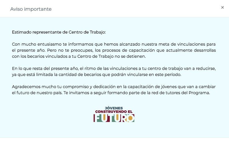 La cuenta de 'Jóvenes Construyendo el Futuro' en Twitter publicó hasta las 20:00 horas (local) del 5 de agosto un mensaje con un video explicativo: "Ya alcanzamos la meta de vinculaciones para 2019. Agradecemos a nuestra comunidad de tutores y becarios por su esfuerzo", se lee.