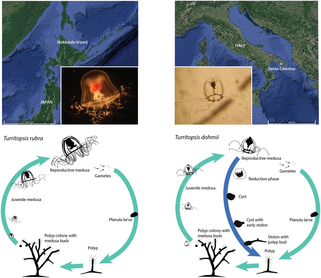 Se trata de la pequeña medusa Turritopsis dohrnii, anteriormente clasificada como T. Nutricula, que tiene un diámetro máximo es de 4,5 mm y es biológicamente inmortal, ya que es capaz de volver repetida e indefinidamente a un estado anterior asexual denominado pólipo. De esa forma puede evitar su muerte por envejecimiento, mientras que otras medusas tienen una longevidad muy corta, de dos a seis meses.