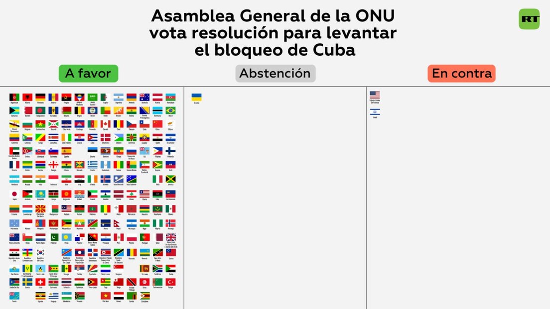 En esta oportunidad, el proyecto presentado por la isla fue adoptado con 187 votos a favor, la abstención de Ucrania; y los dos habituales votos en contra de EE.UU. e Israel.