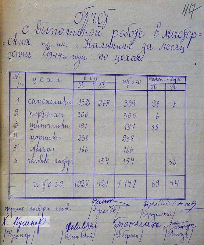 Según los documentos de archivo, Haim era el jefe de este taller: en los informes del trabajo realizado en abril y mayo de 1944 aparece la firma: "H. Kushner".
